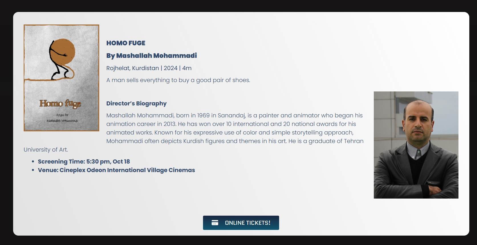 IRAN FILM PORT (An Iranian Films Agency and Distribution) announces formally and proudly that the short animation named "Homo Fuge", directed and produced by "Mashaallah Mohammadi" has been officially selected at "Vancouver Kurdish Film Festival (VKFF)" in Canada 2025. This film is being distributed by "IRAN FILM PORT" company, under the supervision of "ALIMOHAMMAD EGHBALDAR".