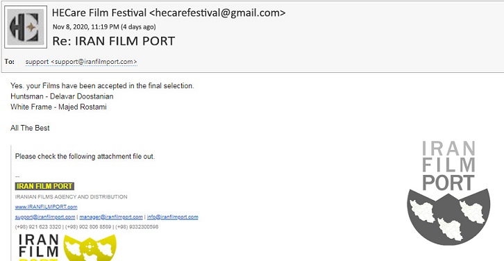 به گزارش «درگاه فیلم ایران» فیلم های کوتاه «شکارچی» دلاور دوستانیان (چهارمین حضور بین المللی) در بخش اصلی و «قاب سفید» ماجد رستمی زاده در بخش کرونا جشنواره HeCare کانادا پذیرفته شدند.