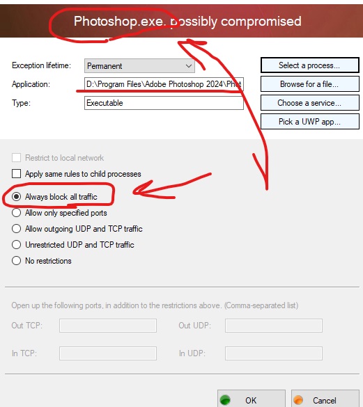 سپس از لیست زیر آن، گزینه Always block all traffic را انتخاب کنید و apply/ok کنید.