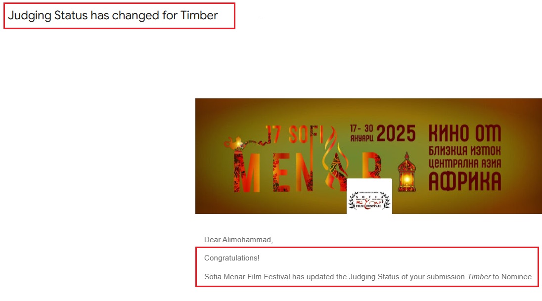 IRAN FILM PORT (An Iranian Films Agency and Distribution) announces formally and proudly that the short film named "Timber", directed and produced by "Mahmood Saeedikia" has been officially nominated at "18th Sofia MENAR Film Festival" in Bulgaria 2026. This film is being distributed by IRAN FILM PORT company, under the supervision of "ALIMOHAMMAD EGHBALDAR".