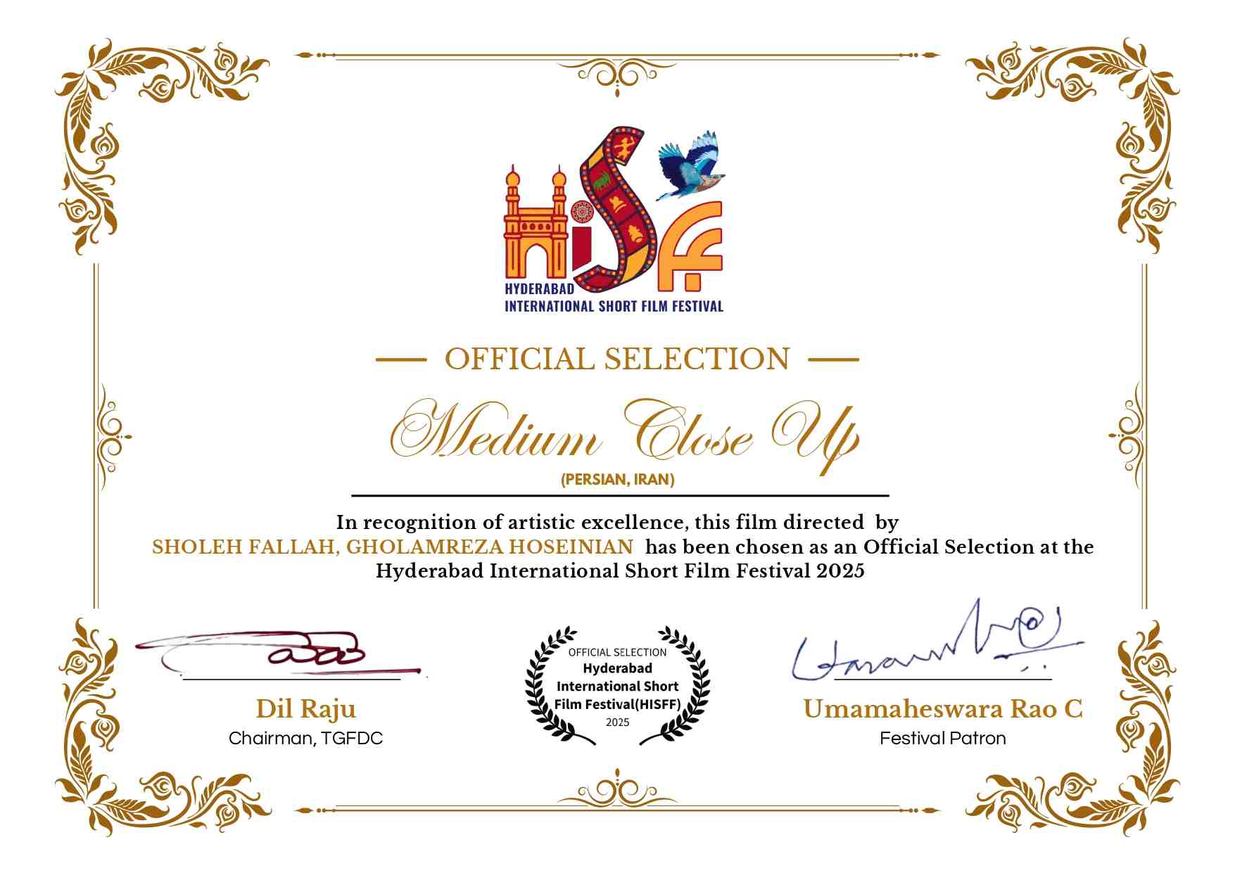 IRAN FILM PORT (Iranian Films Agency and Distribution) announces formally and proudly that the "MEDIUM CLOSE UP", co-directed by "Sholeh Fallah" and "Gholamreza Hosseinian" produced by "Gholamreza Hosseinian" has just been recieved its official certificate for "Hyderabad International Short Film Festival" in India 2025. This animation is being distributed by IRAN FILM PORT company, under the supervision of "ALIMOHAMMAD EGHBALDAR".
