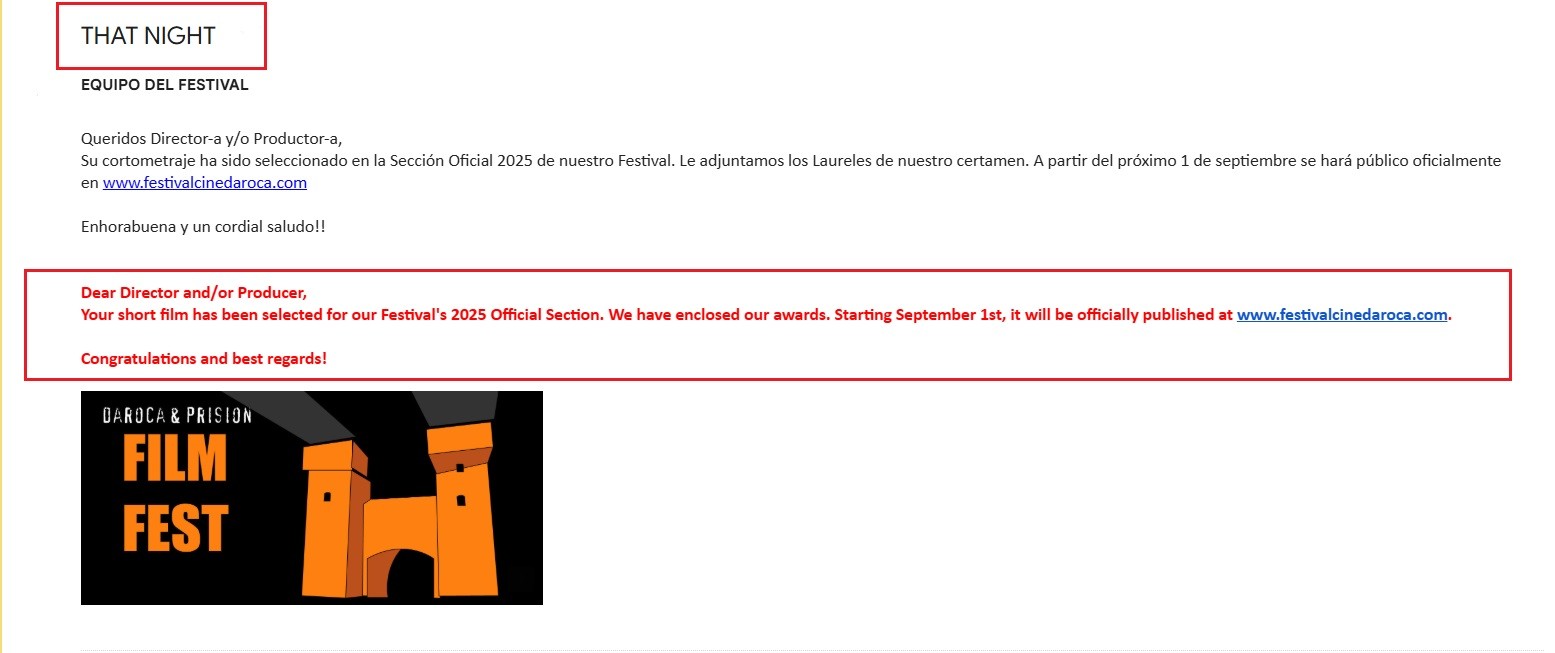 IRAN FILM PORT (An Iranian Films Agency and Distribution) announces formally and proudly that the short film named "That Night", Directed and produced by "Morteza Ghaseminia" has been officially selected at "14th Daroca & Prisión Film Fest" in Spain 2025. This film is being distributed by "IRAN FILM PORT" company, under the supervision of "ALIMOHAMMAD EGHBALDAR".