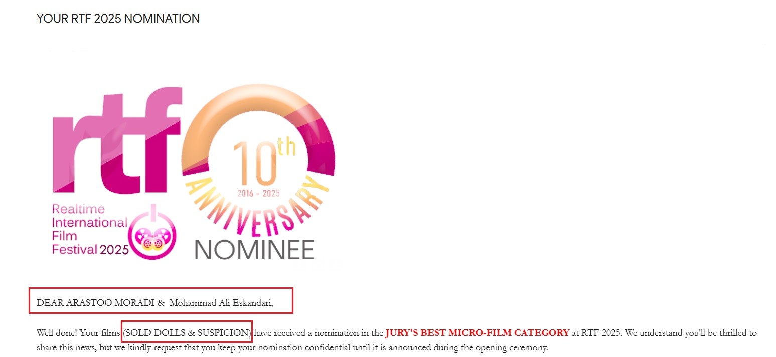 IRAN FILM PORT (An Iranian Films Agency and Distribution) announces formally and proudly that two short films named "Suspicion", directed and produced by "Mohammad Ali Eskandari", "Sold Dolls", directed and produced by "Arastoo Moradi" have been the nominated in "10th Realtime International Film Festival (RTF)" in UK 2025. These short films are being distributed by "IRAN FILM PORT" company, under the supervision of "ALIMOHAMMAD EGHBALDAR".