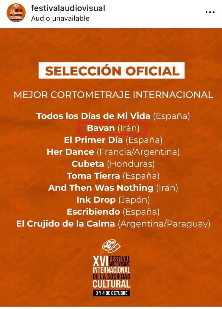 IRAN FILM PORT (An Iranian Films Agency and Distribution) announces formally and proudly that the short film named "Bavan", directed by "Mona (Masoumeh) Pourkeshavarz" and produced by "Amirali Hosseinibay" has been officially selected at "16th Festival International De La Sociedad Cultural" in Paraguay 2025. This film is being distributed by "IRAN FILM PORT" company, under the supervision of "ALIMOHAMMAD EGHBALDAR".