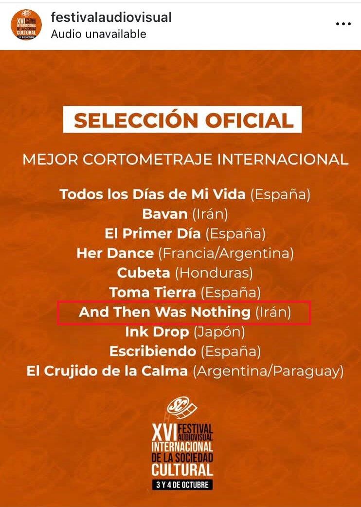 IRAN FILM PORT (An Iranian Films Agency and Distribution) announces formally and proudly that the short film named "AND THEN WAS NOTHING", directed by "Parsa Dehghanian" and produced by "Iman Ebrahimi" has been officially selected at "16th Festival International De La Sociedad Cultural" in Paraguay 2025. This film is being distributed by "IRAN FILM PORT" company, under the supervision of "ALIMOHAMMAD EGHBALDAR".