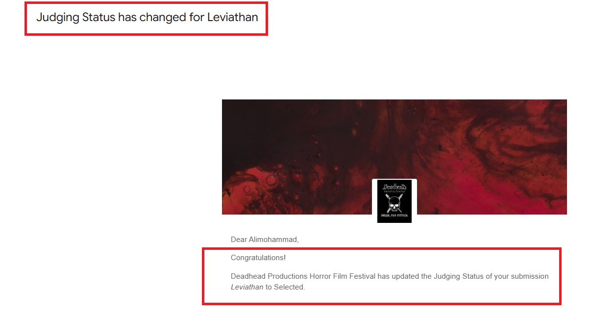 IRAN FILM PORT (An Iranian Films Agency and Distribution) announces formally and proudly that the short film named "Leviathan", directed by "Mohammad Amin Shafipour" and produced by "Ali Shafipour" has been officially selected at "Deadhead Productions Horror Film Festival" in USA 2025. This film is being distributed by "IRAN FILM PORT" company, under the supervision of "ALIMOHAMMAD EGHBALDAR".