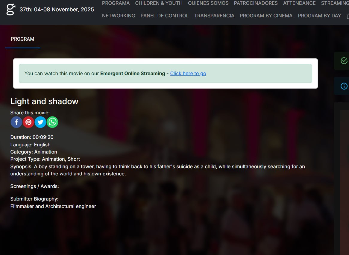 به گزارش «درگاه فیلم ایران» انیمیشن کوتاه «نور و سایه» به کارگردانی و تهیه کنندگی «محمدجواد بلالی» و پخشکنندگی «درگاه فیلم ایران» به مدیریت «علیمحمد اقبالدار»، دومین حضور خود را در 37 امین دوره جشنواره بین المللی «Girona Film Festival» اسپانیا تجربه خواهد کرد. گفتنی است که، این فیلم اولین حضور خود را در جشنواره بین المللی «CinemaBriz Film Festival» اسپانیا - 2025 تجربه کرده است.