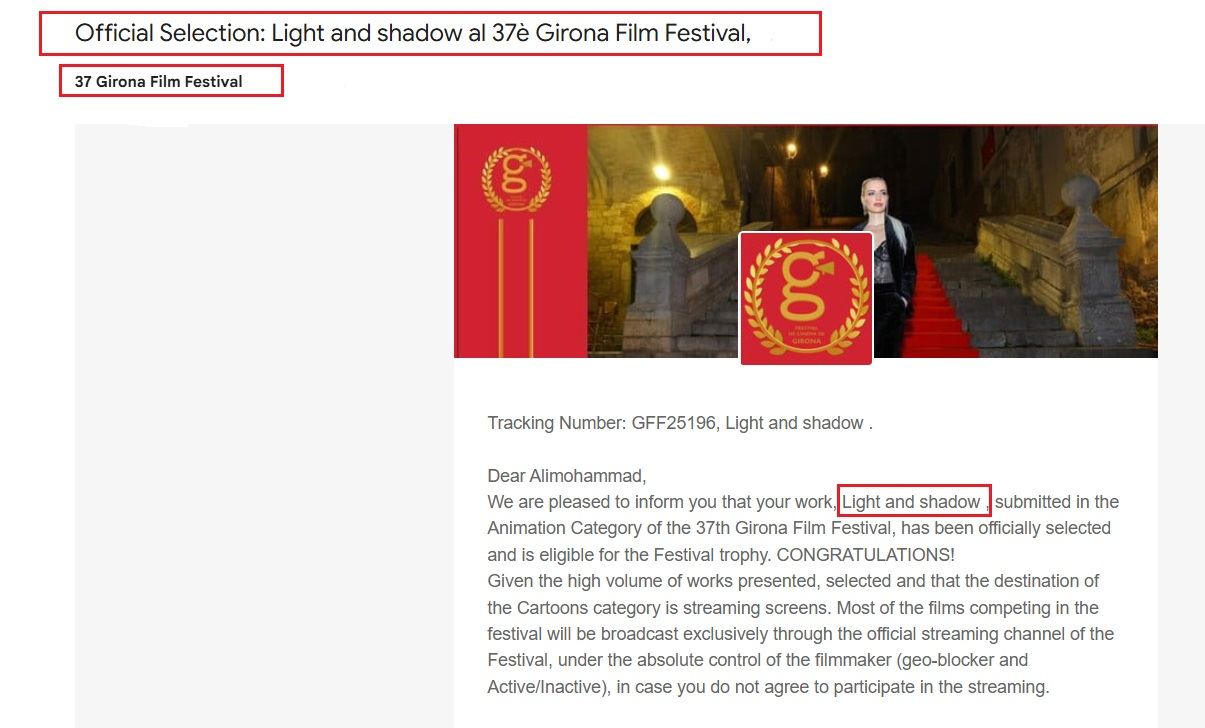 IRAN FILM PORT (An Iranian Films Agency and Distribution) announces formally and proudly that the animation named "Light and Shadow", directed and produced by "Mohammad Javad Balali" has been officially selected at "37th Girona Film Festival" in Spain 2025. This film is being distributed by "IRAN FILM PORT" company, under the supervision of "ALIMOHAMMAD EGHBALDAR".