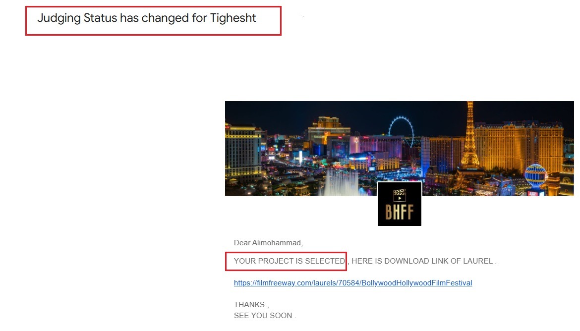 IRAN FILM PORT (An Iranian Films Agency and Distribution) announces formally and proudly that the feature film named "Tighesht", directed and produced by "Mehdi Heidari" has been officially selected at "Bollywood Hollywood Film Festival Las Vegas" in USA 2025. This film is being distributed by "IRAN FILM PORT" company, under the supervision of "ALIMOHAMMAD EGHBALDAR".