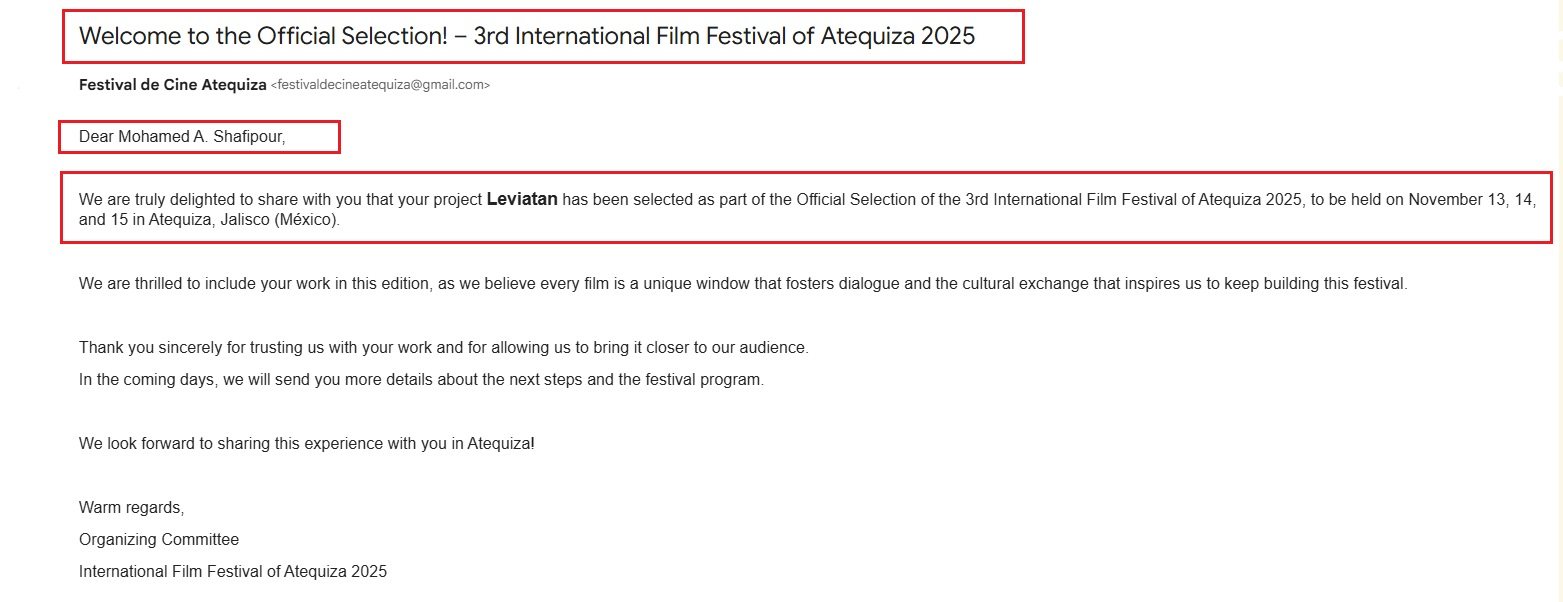 IRAN FILM PORT (An Iranian Films Agency and Distribution) announces formally and proudly that the short film named "Leviathan", directed by "Mohammad Amin Shafipour" and produced by "Ali Shafipour" has been officially selected at "Atequiza Jalisco International Film Festival" in Mexico 2025. This film is being distributed by "IRAN FILM PORT" company, under the supervision of "ALIMOHAMMAD EGHBALDAR".