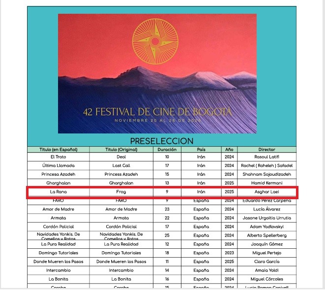 IRAN FILM PORT (An Iranian Films Agency and Distribution) announces formally and proudly that the short film named "FROG", directed and produced by "Asghar Laei", has been officially selected for "42th Bogota Film Festival" in Colombia 2025. This short film is being distributed by "IRAN FILM PORT" company, under the supervision of "ALIMOHAMMAD EGHBALDAR".