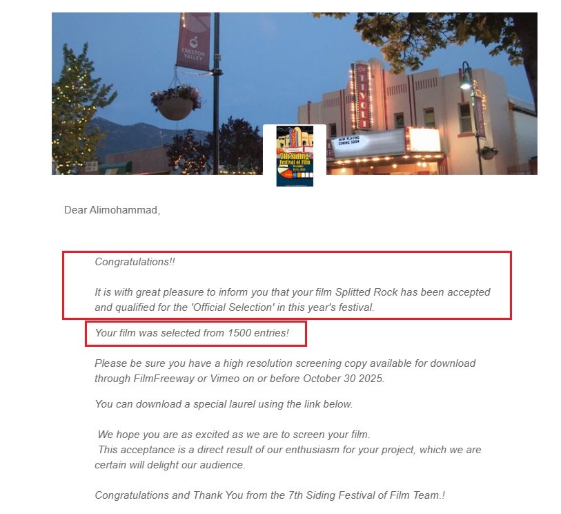 IRAN FILM PORT (An Iranian Films Agency and Distribution) announces formally and proudly that the short film named "Splitted Rock", directed and produced by "Salim Ensafi" has been officially selected at "7th Siding Festival of Film" in Canada 2025. This film is being distributed by "IRAN FILM PORT" company, under the supervision of "ALIMOHAMMAD EGHBALDAR".
