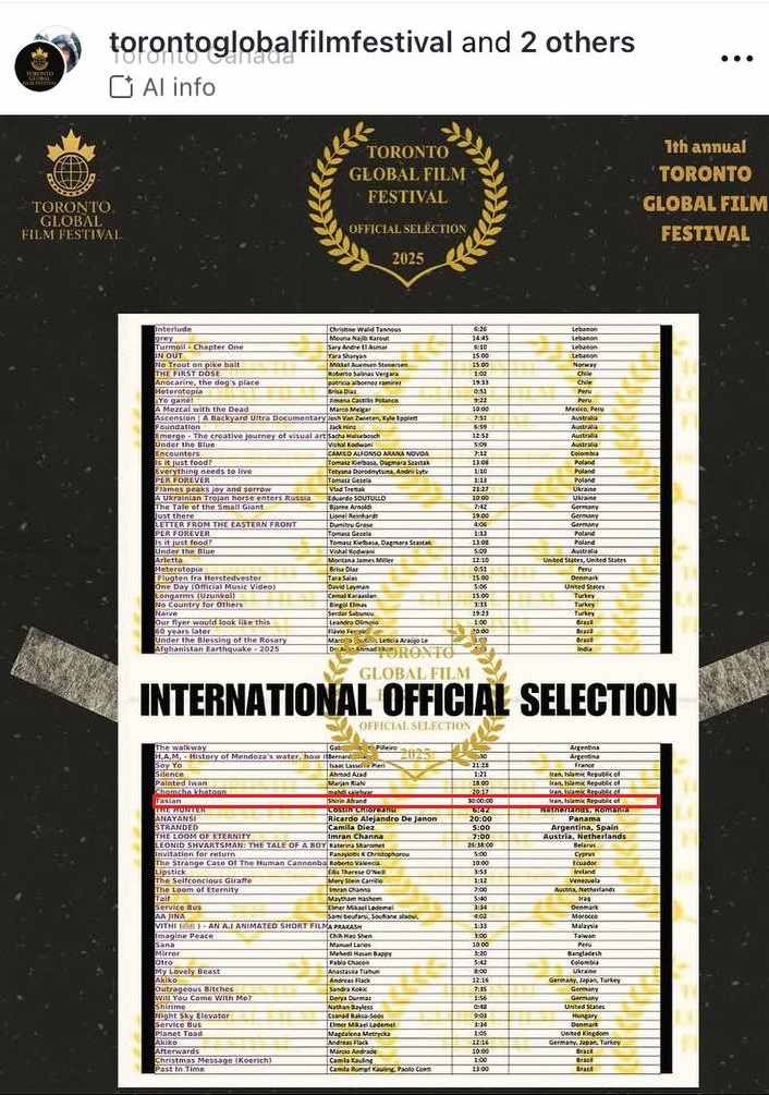 IRAN FILM PORT (An Iranian Films Agency and Distribution) announces formally and proudly that the short Documentary named Tasian "Forlorn", directed and produced by "Shirin Afrand" has been officially selected at "Toronto Global Film Festival" in Canada 2025. This film is being distributed by "IRAN FILM PORT" company, under the supervision of "ALIMOHAMMAD EGHBALDAR".