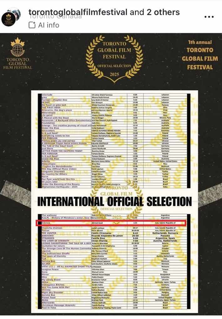 IRAN FILM PORT (An Iranian Films Agency and Distribution) announces formally and proudly that the Documentary film named "Silence", co-directed by "Ahmad Azad" and "Behrooz Moavenian" and produced by "Ahmad Azad" has been officially selected at "Toronto Global Film Festival" in Canada 2025. This film is being distributed by "IRAN FILM PORT" company, under the supervision of "ALIMOHAMMAD EGHBALDAR".