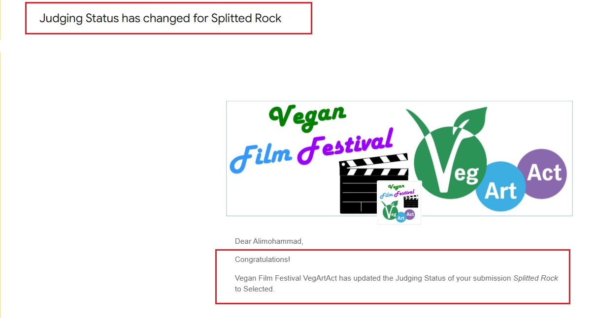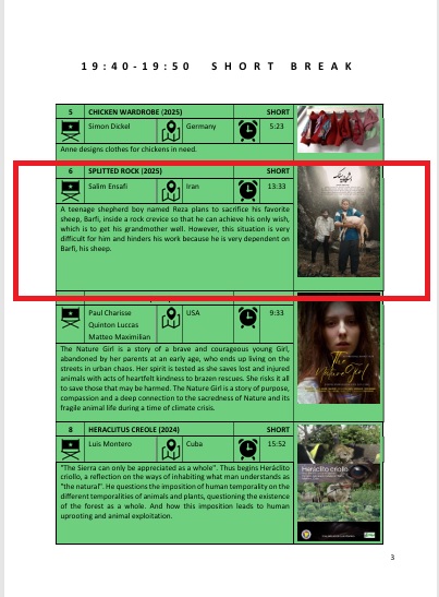 IRAN FILM PORT (An Iranian Films Agency and Distribution) announces formally and proudly that the short film named "Splitted Rock", directed and produced by "Salim Ensafi" has been officially selected at "The Vegan Film Festival VegArtAct" in Greece 2025. This film is being distributed by "IRAN FILM PORT" company, under the supervision of "ALIMOHAMMAD EGHBALDAR".