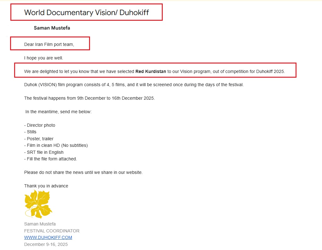 IRAN FILM PORT (An Iranian Films Agency and Distribution) announces formally and proudly that the sdocumentary film named "RED KURDISTAN", directed by "Ahmad Alahveisi" and produced by "Kaivan Shokri" has been officially selected at "12th Duhok International Film Festival" in Iraq 2025. This film is being distributed by "IRAN FILM PORT" company, under the supervision of "ALIMOHAMMAD EGHBALDAR".