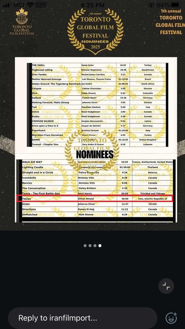 IRAN FILM PORT (An Iranian Films Agency and Distribution) announces formally and proudly that the short Documentary named Tasian "Forlorn", directed and produced by "Shirin Afrand" has been officially nominated at "Toronto Global Film Festival" in Canada 2025. This film is being distributed by "IRAN FILM PORT" company, under the supervision of "ALIMOHAMMAD EGHBALDAR".