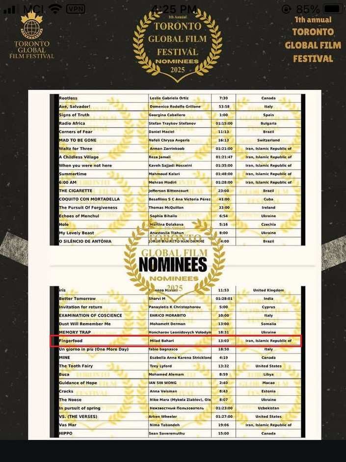 IRAN FILM PORT (An Iranian Films Agency and Distribution) announces formally and proudly that the short film named "Fingerfood", directed and produced by "Milad Bahari" has been officially nominated at "Toronto Global Film Festival" in Canada 2025. This film is being distributed by "IRAN FILM PORT" company, under the supervision of "ALIMOHAMMAD EGHBALDAR".