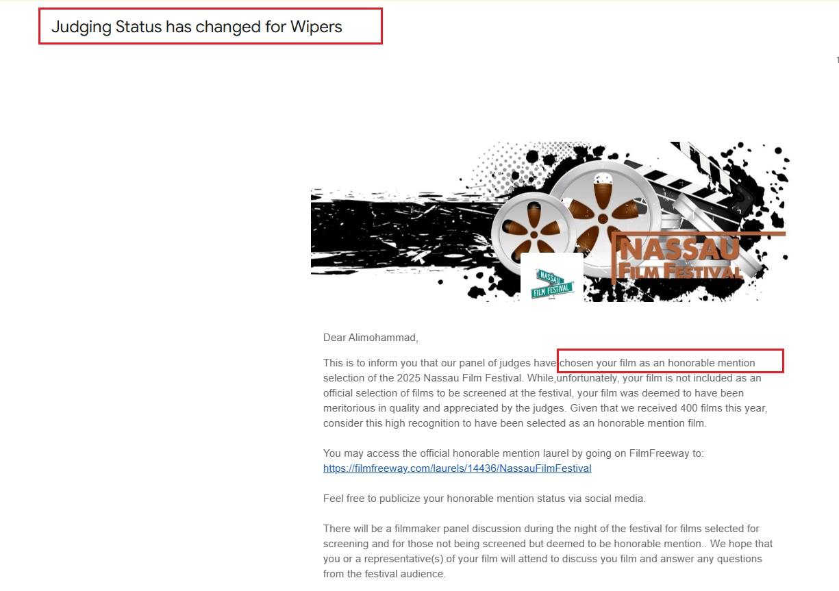 IRAN FILM PORT (An Iranian Films Agency and Distribution) announces formally and proudly that the short film named "Wipers", Directed by "Amirhossein Keyghobadi" and produced by "Sara Javaheri", has been officially selected for "10th Annual Nassau Film Festival" in USA 2025. This short film is being distributed by "IRAN FILM PORT" company, under the supervision of "ALIMOHAMMAD EGHBALDAR".