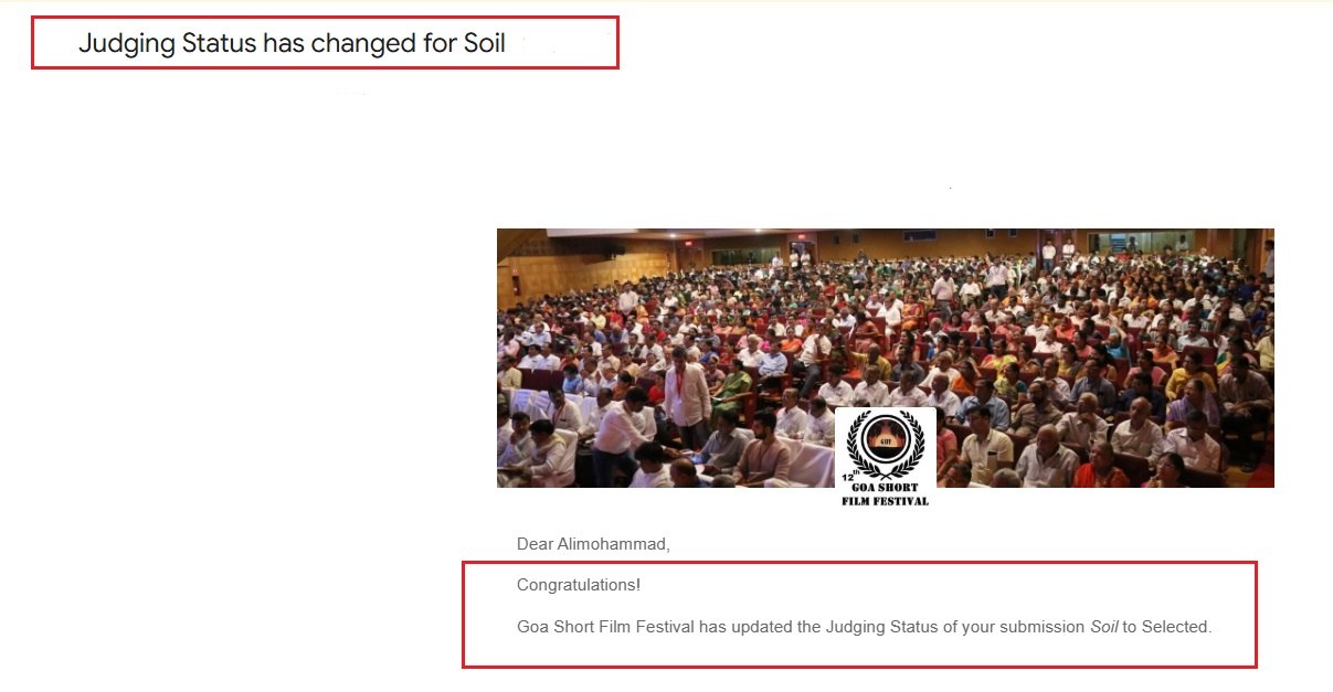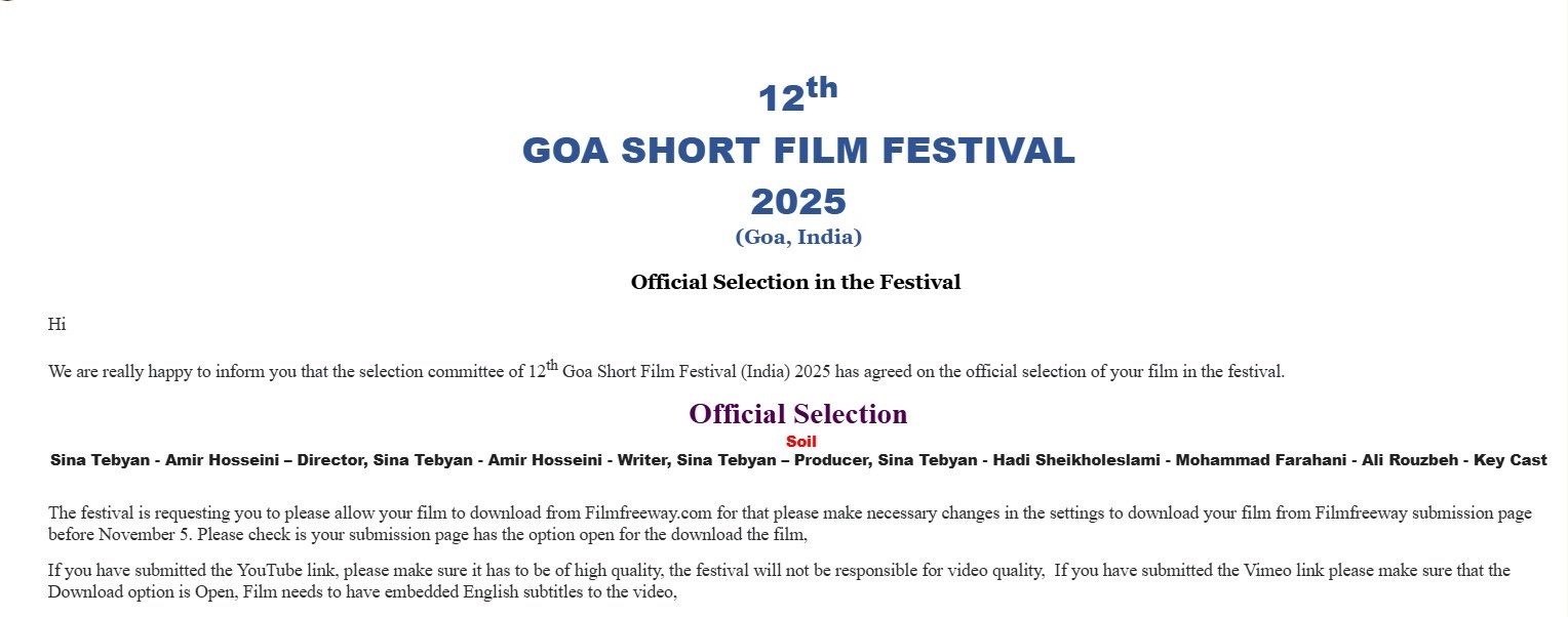IRAN FILM PORT (An Iranian Films Agency and Distribution) announces formally and proudly that the short film named "Soil" co-directed by "Sina Tebyan" and "Amir Hosseini" has been officially selected at "12th Goa Short Film Festival" in India 2025. This film is being distributed by "IRAN FILM PORT" company, under the supervision of "ALIMOHAMMAD EGHBALDAR".