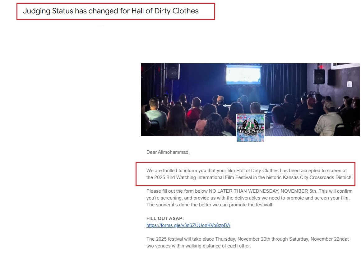 IRAN FILM PORT (An Iranian Films Agency and Distribution) announces formally and proudly that the short film named "Hall Of Dirty Clothes", directed and produced by "Hossein Zahmatkesh", has been officially selected for "Bird Watching International Film Festival" in USA 2025. This short film is being distributed by "IRAN FILM PORT" company, under the supervision of "ALIMOHAMMAD EGHBALDAR".