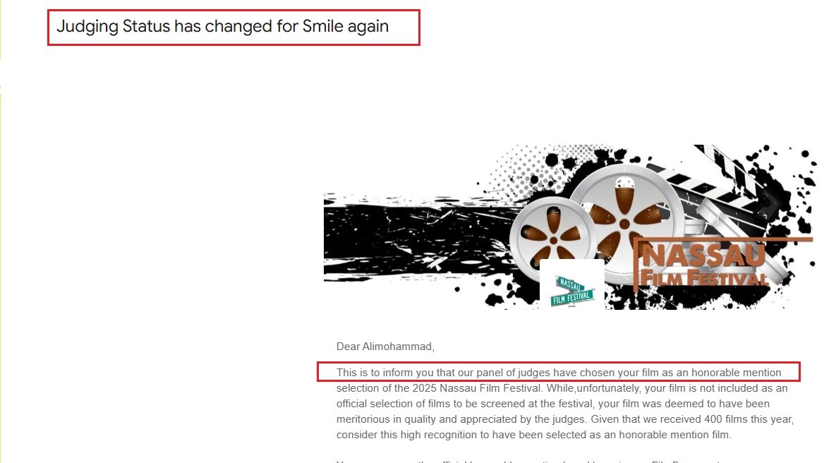 IRAN FILM PORT (An Iranian Films Agency and Distribution) announces formally and proudly that the short film named "Smile Again", directed and produced by "Zahra Gholipour", has been officially selected for "10th Annual Nassau Film Festival" in USA 2025. This short film is being distributed by "IRAN FILM PORT" company, under the supervision of "ALIMOHAMMAD EGHBALDAR".