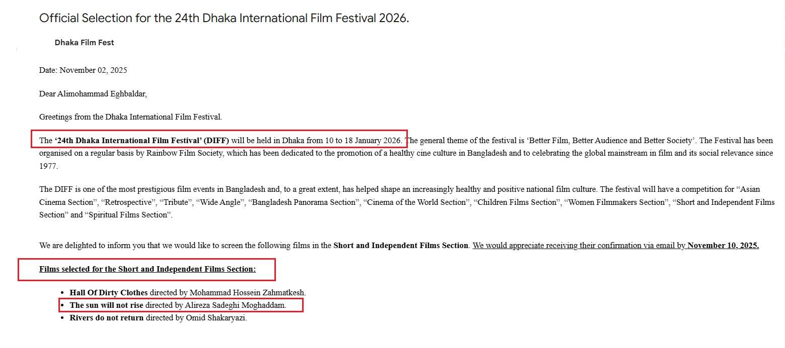 IRAN FILM PORT (An Iranian Films Agency and Distribution) announces formally and proudly that the short film named "The Sun Will Not Rise", Directed by "Alireza Sadeghi Moghadam" and co-produced by "Ali Gholami Mehr and Gholamreza Mousavi", has been officially selected for "24th Dhaka International Film Festival" in Bangladesh 2026. This short film is being distributed by "IRAN FILM PORT" company, under the supervision of "ALIMOHAMMAD EGHBALDAR".