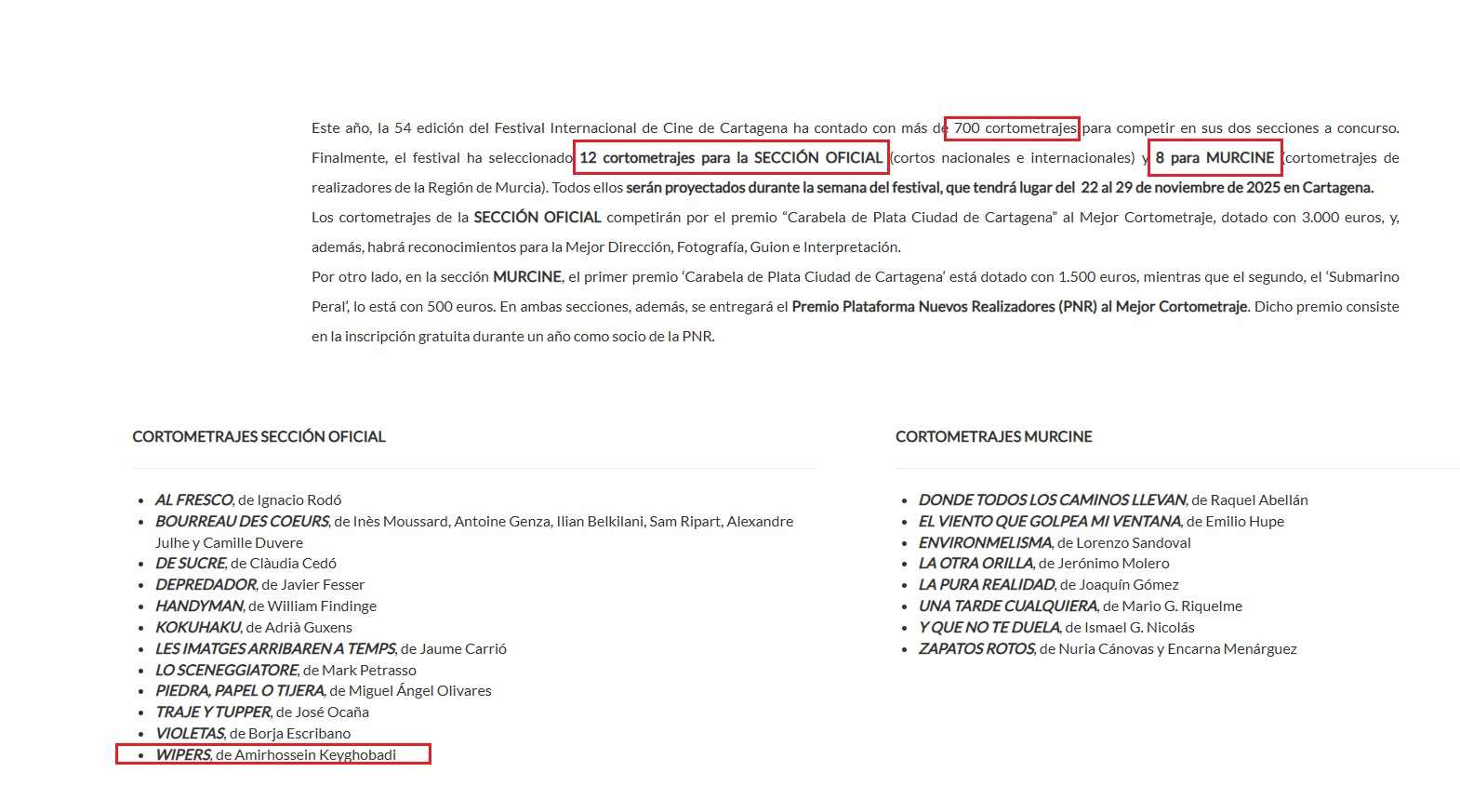 IRAN FILM PORT (An Iranian Films Agency and Distribution) announces formally and proudly that the short film named "Wipers", Directed by "Amirhossein Keyghobadi" and produced by "Sara Javaheri", has been officially selected for "54th Cartagena International Film Festival" in Spain 2025. This short film is being distributed by "IRAN FILM PORT" company, under the supervision of "ALIMOHAMMAD EGHBALDAR".