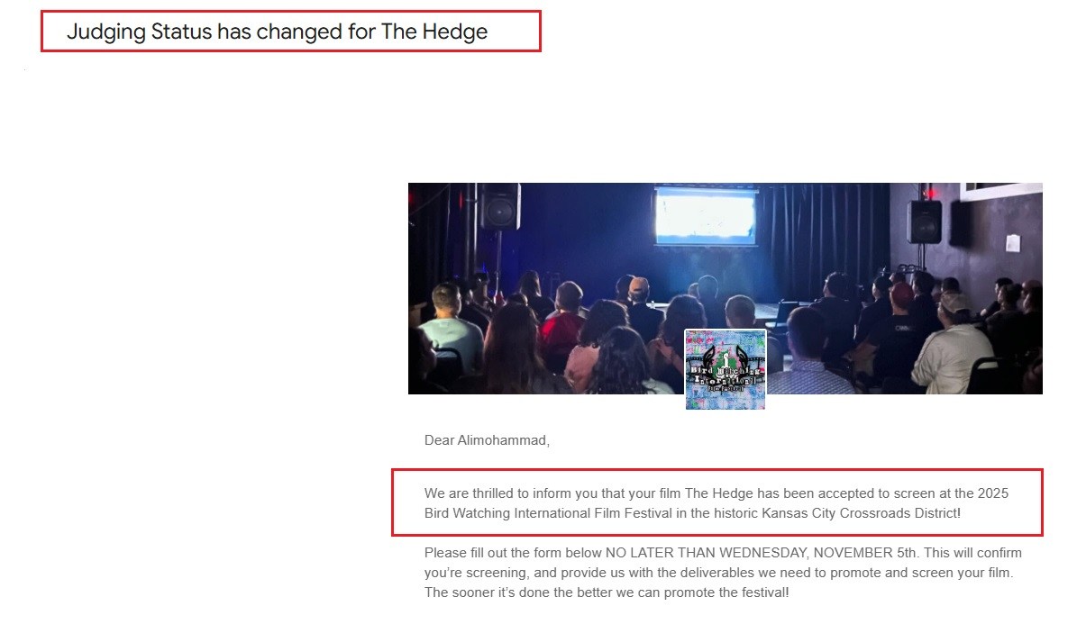 IRAN FILM PORT (An Iranian Films Agency and Distribution) announces formally and proudly that the short film named "THE HEDGE" short film, co-directed by "Fatemeh Ghavam" and "Eissa nourazar" produced by "Isa nurazar", has been officially selected for "Bird Watching International Film Festival" in USA 2025. This short film is being distributed by "IRAN FILM PORT" company, under the supervision of "ALIMOHAMMAD EGHBALDAR".
