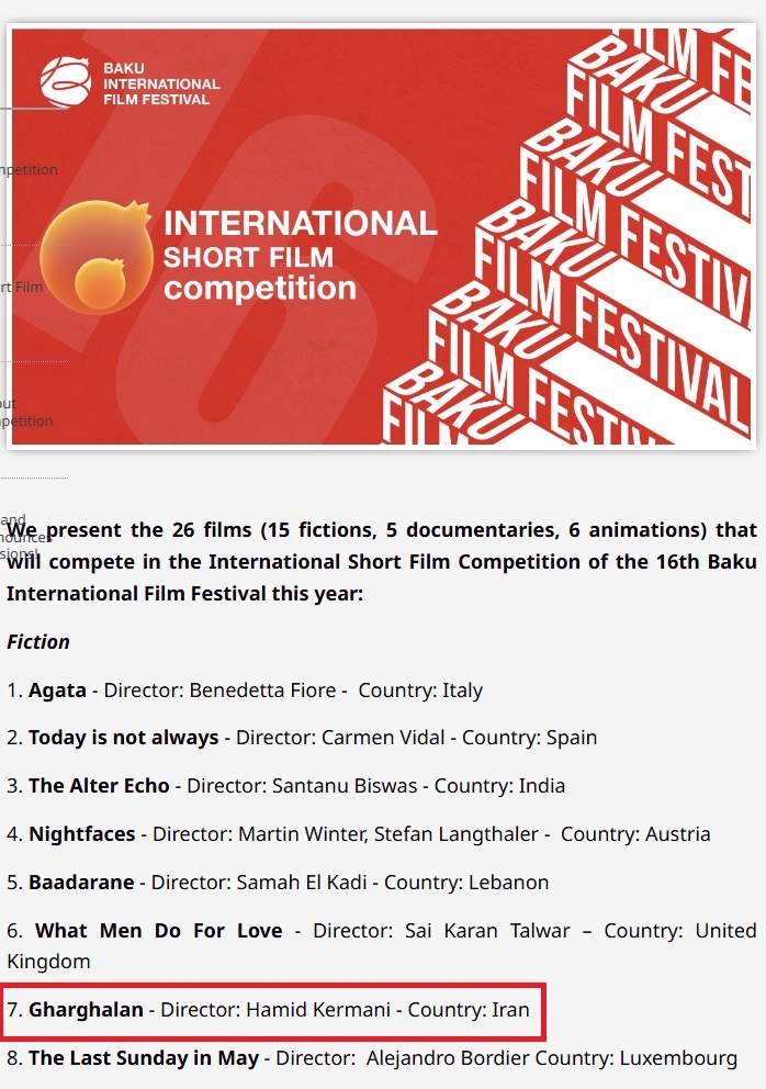 IRAN FILM PORT (An Iranian Films Agency and Distribution) announces formally and proudly that the short film named "Gharghalan", Directed and produced by "Seyed Hamid Kermani", has been officially selected for "16th Baku International Film Festival" in Azerbaijan 2025. This short film is being distributed by "IRAN FILM PORT" company, under the supervision of "ALIMOHAMMAD EGHBALDAR".