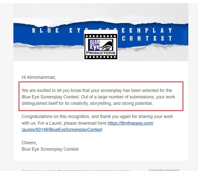 IRAN FILM PORT (An Iranian Films Agency and Distribution) announces formally and proudly that the short screenplay named "Man and the Octopus" short screenplay, written by "Reza Ahmadi" has been officially selected for "Blue Eye Screenplay Contest" in USA 2025. This short screenplay is being distributed by "IRAN FILM PORT" company, under the supervision of "ALIMOHAMMAD EGHBALDAR".