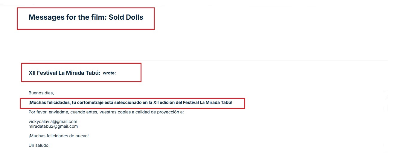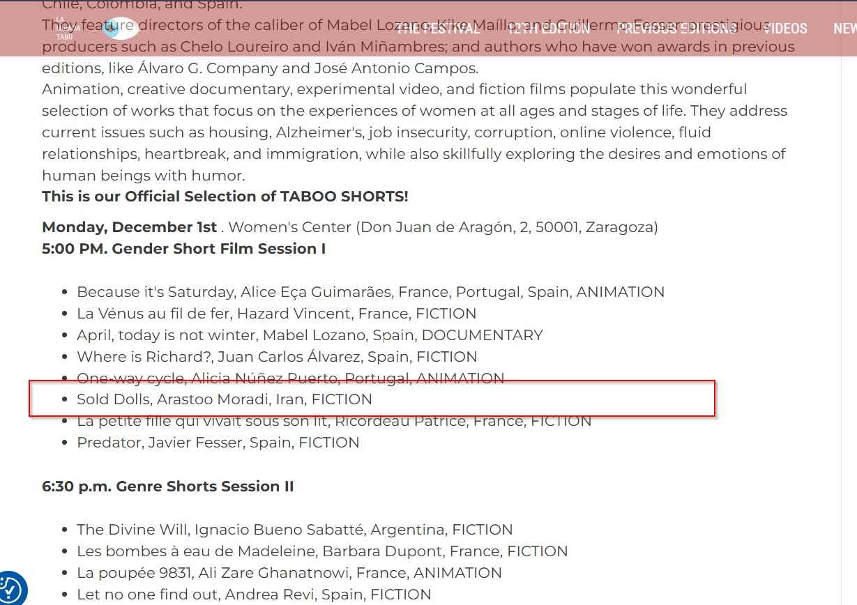 IRAN FILM PORT (An Iranian Films Agency and Distribution) announces formally and proudly that the short film named "Sold Dolls", directed and produced by "Arastoo Moradi" has been officially selected at "12th THE TABOO LOOK" in Spain 2025. This film is being distributed by "IRAN FILM PORT" company, under the supervision of "ALIMOHAMMAD EGHBALDAR".