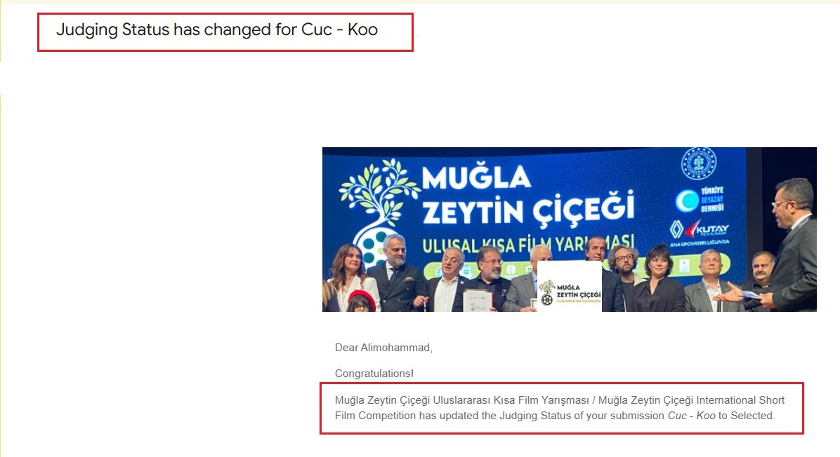 IRAN FILM PORT (An Iranian Films Agency and Distribution) announces formally and proudly that the short film named "Cuc Koo", directed by "Masoud Moarefi" and produced by "Hossein Motamednia" has been officially selected for Asian Film Festival at "Muğla Zeytin Çiçeği Uluslararası Kısa Film Yarışması" in Turkey 2025. This film is being distributed by "IRAN FILM PORT" company, under the supervision of "ALIMOHAMMAD EGHBALDAR".