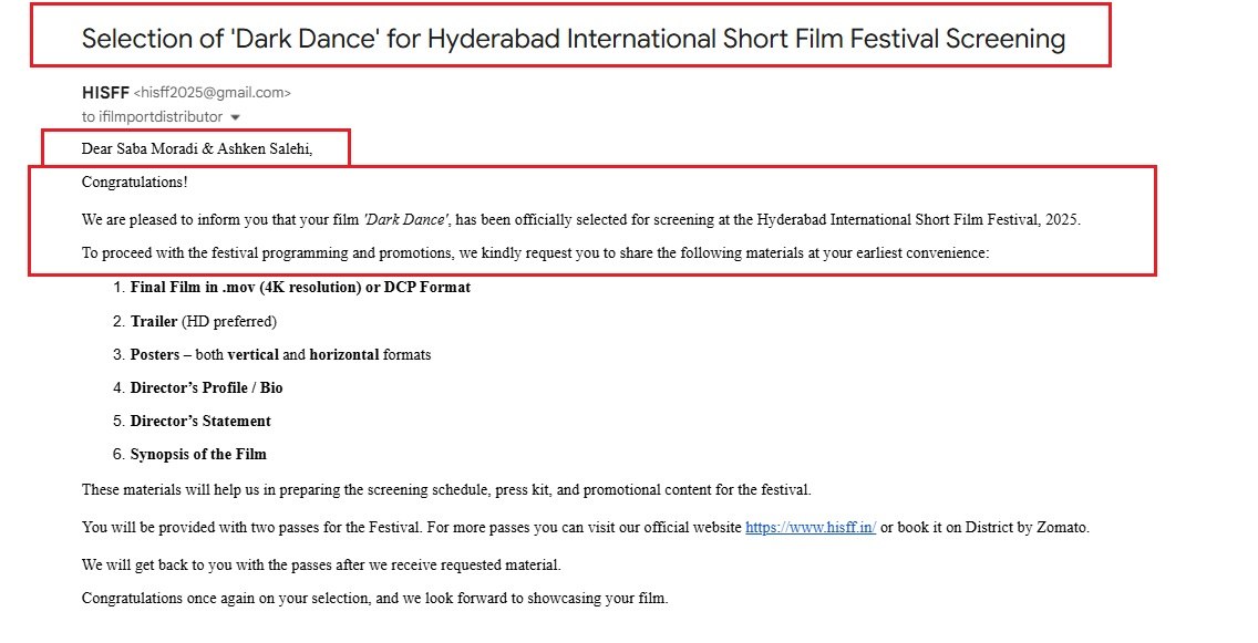 IRAN FILM PORT (An Iranian Films Agency and Distribution) announces formally and proudly that the short film named "Dark Dance", co-Directed by "Ashkan Salehi and Saba Moradi" and produced by "Saba Moradi" has been officially selected for "Hyderabad International Short Film Festival" in India 2025. This film is being distributed by IRAN FILM PORT company, under the supervision of "ALIMOHAMMAD EGHBALDAR".