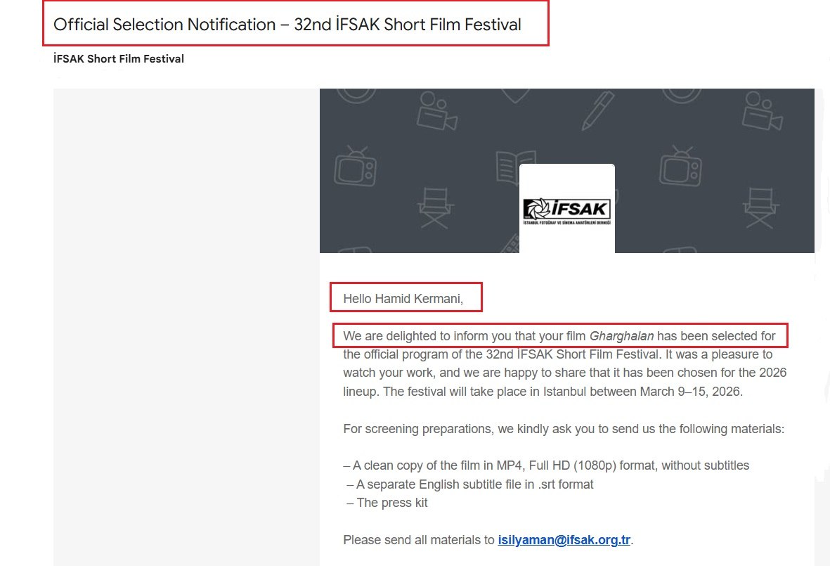 IRAN FILM PORT (An Iranian Films Agency and Distribution) announces formally and proudly that the short film named "Gharghalan", Directed and produced by "Seyed Hamid Kermani", has been officially selected for "32nd İFSAK Short Film Festival" in Turkey 2026. This short film is being distributed by "IRAN FILM PORT" company, under the supervision of "ALIMOHAMMAD EGHBALDAR".