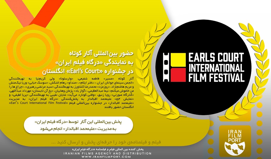 به گزارش «درگاه فیلم ایران» آثار کوتاه «مسیر» فاطمه شفیعی، «وارسلونا» ولی کریم‌نیا به تهیه‌کنندگی «انجمن سینمای جوانان ایران - دفتر ایلام»، «منداو» رهام اشکش، «سوسک حبابی» وریا نیک‌منش و مریم هاشم‌نژاد، «روزمزد» محمدرضا کشاورز به تهیه‌کنندگی «سید مرتضی رهبری»، «چراغ ها را من خاموش میکنم» نیما عبدالعظیمی، «آواز باد» پژمان وهابیان، «یخ آن تابستان» مهرداد عبداللهی، «گذرگاه صورتی» رویا زنبق، «وقتی کوتارد می‌آید» شایان نقیبی به تهیه‌کنندگی «پریا لطیفی» و «نمایش 54» علیمحمد اقبالدار به پخش‌کنندگی «درگاه فیلم ایران» به مدیریت «علیمحمد اقبالدار» در جشنواره بین‌المللی فیلم «Earl’s Court International Film Festival» انگلستان حضور یافتند.