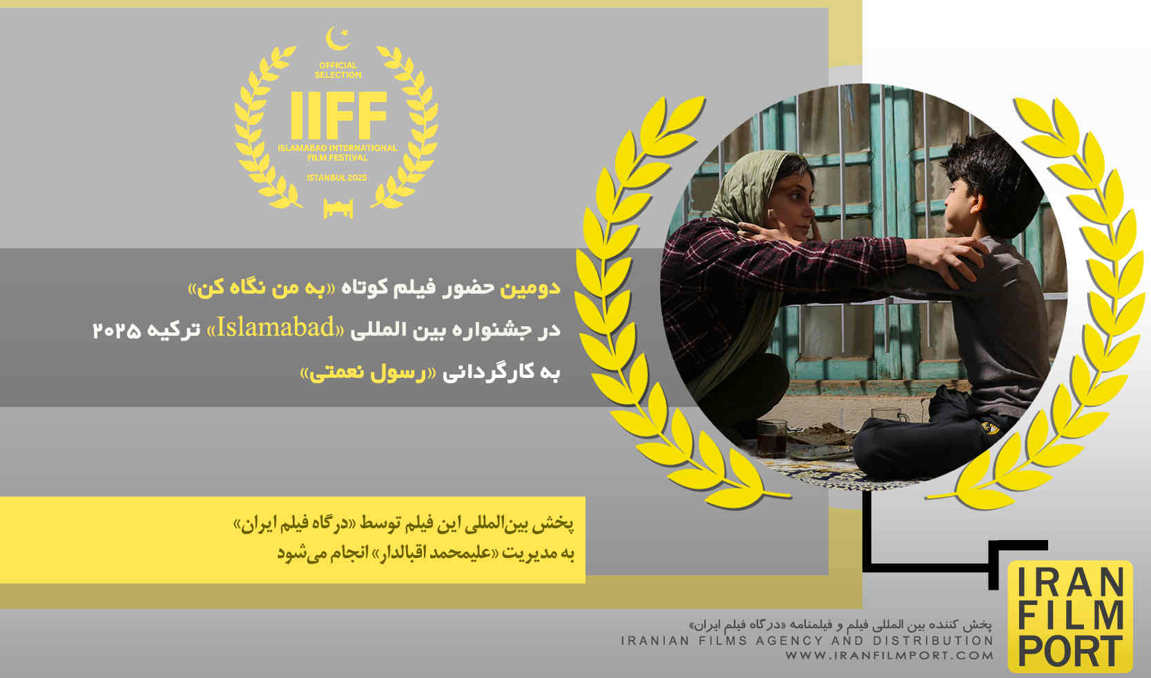 IRAN FILM PORT (An Iranian Films Agency and Distribution) announces formally and proudly that the short film named "LOOK AT ME", directed and produced by "Rasoul Nemati" has been officially selected for "Islamabad International Film Festival" in Turkey 2025. This short film is being distributed by "IRAN FILM PORT" company, under the supervision of "ALIMOHAMMAD EGHBALDAR".