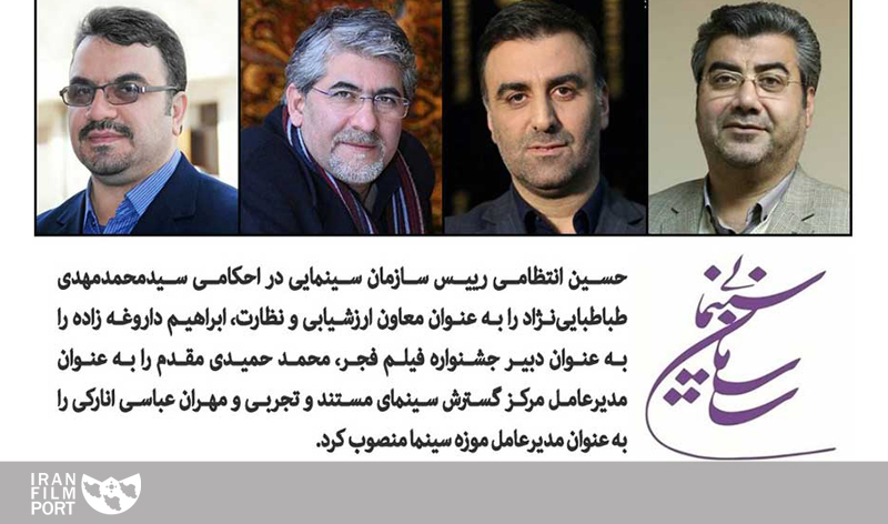 به گزارش درگاه فیلم ایران و به نقل از پایگاه خبری فیلم کوتاه، رییس سازمان سینمایی سیدمحمدمهدی طباطبایینژاد را به عنوان معاون ارزشیابی و نظارت، ابراهیم داروغه زاده را به عنوان دبیر جشنواره فیلم فجر، محمد حمیدی مقدم را به عنوان مدیرعامل مرکز گسترش سینمای مستند و تجربی و مهران عباسی انارکی را به عنوان مدیرعامل موزه سینما منصوب کرد.