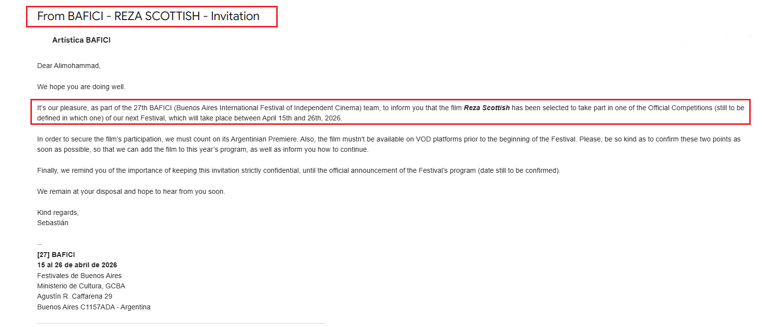 IRAN FILM PORT (An Iranian Films Agency and Distribution) announces formally and proudly that the short film named "Reza Scottish", co-directed by "Alireza Elyasi" and "Alireza Masoumi" has been officially selected at "27th Buenos Aires International Festival of Independent Cinema" in Argentina 2026. This film is being distributed by "IRAN FILM PORT" company, under the supervision of "ALIMOHAMMAD EGHBALDAR".