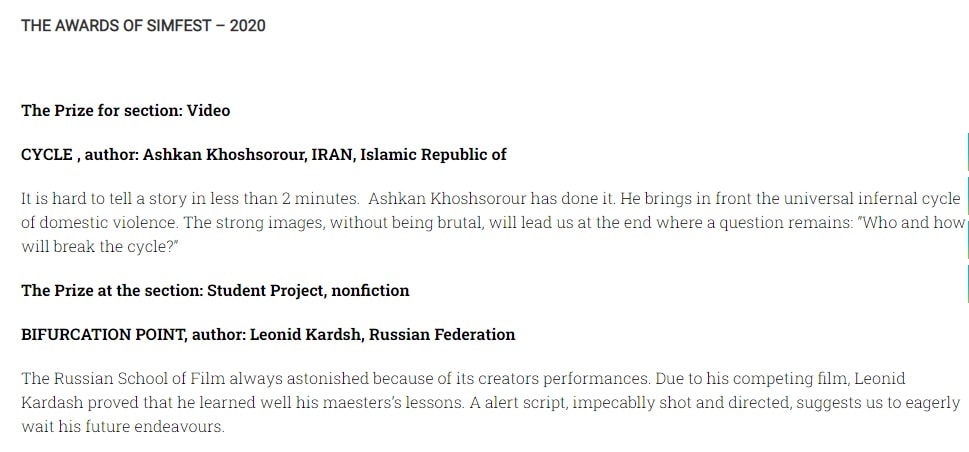 به گزارش «درگاه فیلم ایران» فیلم کوتاه «چرخه» به کارگردانی اشکان خوش سرور برگزیده اول بخش ویدویی جشنواره SIMFEST کشور رومانی شد.