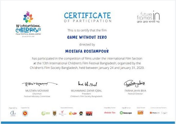 به گزارش «درگاه فیلم ایران» فیلم کوتاه «بازی بدون صفر» به کارگردانی مصطفی رستم پور منتخب سیزدهمین جشنواره Children's Film بنگلادش شد.